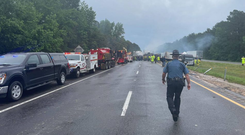 Poco después, a cinco millas de distancia en el lado este de la interestatal, se produjo un incidente mayor que involucró ocho camiones con remolque y al menos tres automóviles, informó el departamento de transporte. Se informó un incendio relacionado con este accidente.