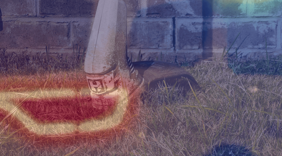 Collage: Luces de patrulla de policia sobre foto de un cortador de malezas. Foto de archivo no tomada en la escena del incidente de esta nota.