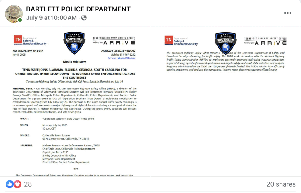 La iniciativa involucra una movilización policial a gran escala, en la que participarán múltiples agencias de seguridad locales, entre ellas la Patrulla de Carreteras de Tennessee (THP), el Departamento del Sheriff del Condado de Shelby, y los departamentos de policía de Memphis, Collierville y Bartlett.