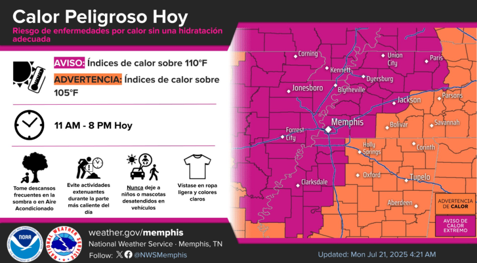 Memphis y ciudades cercanas como Jonesboro, Blytheville, Clarksdale, Forrest City se encuentran dentro de la zona de riesgo máximo, marcada con color fucsia por el Servicio Meteorológico Nacional. Otras áreas como Tupelo, Oxford y Holly Springs están bajo Advertencia de Calor, con índices de entre 105ºF y 110ºF.