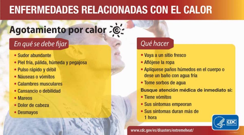 Si experimenta alguno de estos síntomas, muévase a un lugar fresco, beba agua y busque ayuda médica si los síntomas duran más de una hora.