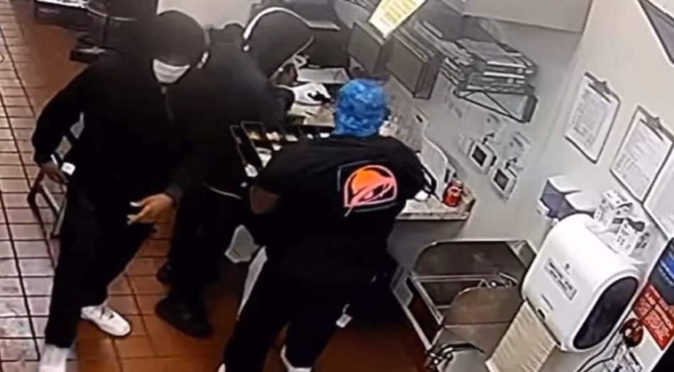Los sospechosos, según el video publicado por la policía el lunes, siguieron a un trabajador a través de una puerta lateral poco después de las 2 a. m. de ese día. Dos de ellos sacaron armas de fuego y apuntaron a los empleados, ordenándoles que se tiraran al suelo.