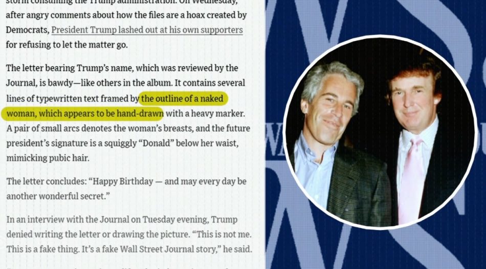 El texto, que según el Journal incluía un mensaje de felicitación y un dibujo de una mujer desnuda, habría formado parte de un libro conmemorativo para el 50.º cumpleaños del financiero en 2003. Trump negó rotundamente el reporte, calificándolo de “FALSO”, y presentó el viernes una demanda por difamación contra el medio, solicitando al menos 20.000 millones de dólares en daños y perjuicios.