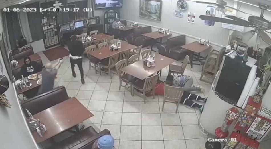 Portaba una pistola de plástico y amenazó a los clientes del restaurante exigiendo su dinero. Uno de los clientes sacó su arma y disparó varias veces al atracador quien murió en el acto.