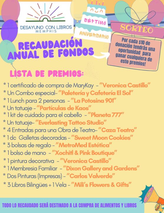 El programa comunitario “Desayuno con Libros” celebrará su séptimo aniversario el sábado 19 de abril de 2025, de 10:00 a.m. a 12:00 p.m. en el Centro Comunitario Gaisman (4213 Macon Rd, Memphis, TN 38122). Los organizadores están invitando al público a sumarse a una recaudación de fondos que apoyará directamente la continuidad de este proyecto educativo y cultural.