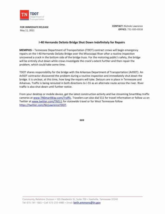 El portavoz de ARDOT ha confirmado que el puente fue cerrado desde la tarde del martes.No se sabe con exactitud cuanto tiempo más podría estar cerrado en el caso que el daño sea algo grave.
