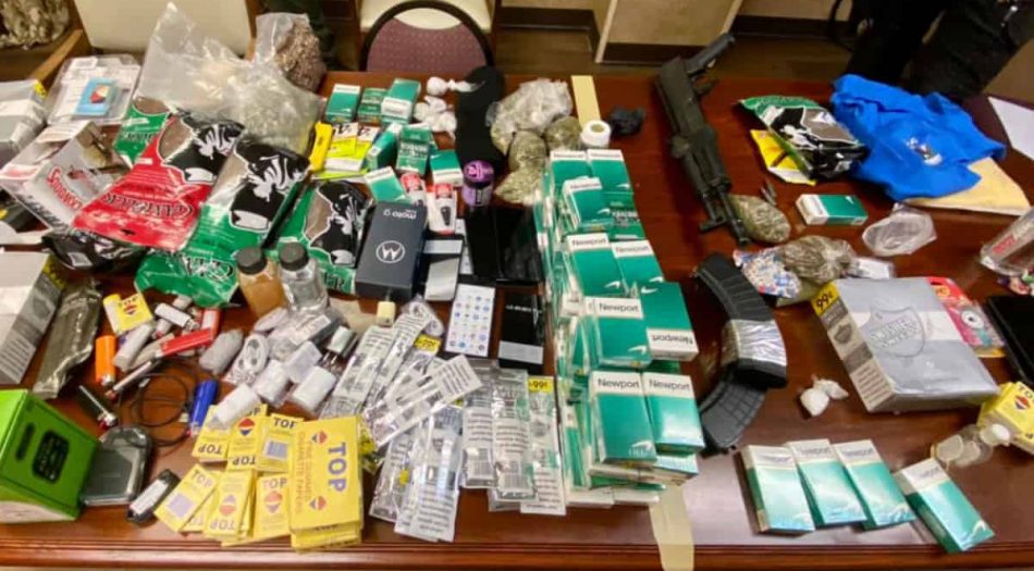 Los paquetes contenían alcohol, marihuana, metanfetamina, formaldehído, tabaco, cuchillos, una sierra, teléfonos celulares y cargadores, cigarros, pastillas y un rifle semiautomático, según WAPT-TV.