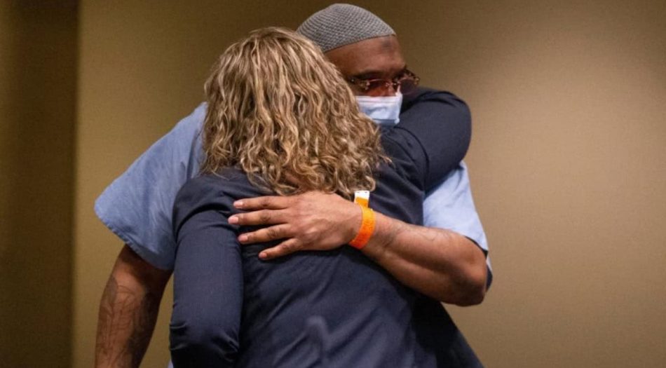 Artis Whitehead, quien ha estado en prisión desde 2003 por cargos relacionados con el robo de B.B. King's en 2002, abraza a Jessica Van Dyke, la abogada principal y directora ejecutiva del Proyecto Inocencia de Tennessee, mientras ingresa a la sala del tribunal penal del condado de Shelby el miércoles 6 de septiembre de 2023. Los abogados del Proyecto Inocencia argumentan que Whitehead fue condenado injustamente por el delito