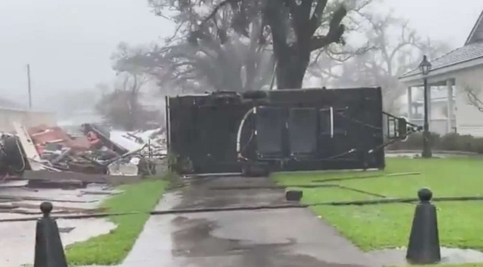 En Houma, Louisiana, un techo enorme fue lanzado por las ráfagas de viento y golpeó un poste de energía frente a Dominator Fore: