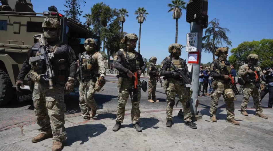La campaña, lanzada el martes por la noche, no escatima en símbolos. Fotografías del presidente Trump y de altos funcionarios de seguridad aparecen junto a frases como “Defiendan la patria”, mientras que en el sitio web oficial, una imagen de un vehículo blindado patrullando una calle urbana muestra a oficiales armados colgados de ambos lados, listos para actuar.