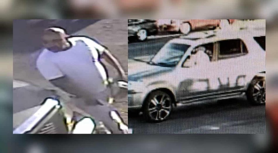 El sospechoso es descrito como un hombre hispano, calvo o con un corte de cabello extremadamente bajo, posiblemente con barba y tatuajes en su brazo derecho, vistiendo una camiseta blanca y pantalones beige, armado con un revólver.