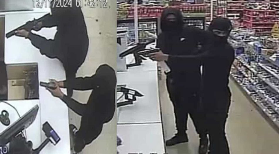 El violento incidente ocurrió en la tienda situada en Union Avenue y South McLean Boulevard. Cámaras de seguridad captaron el momento en que los sospechosos irrumpieron en el local, apuntando sus armas hacia un empleado en la parte frontal del negocio.