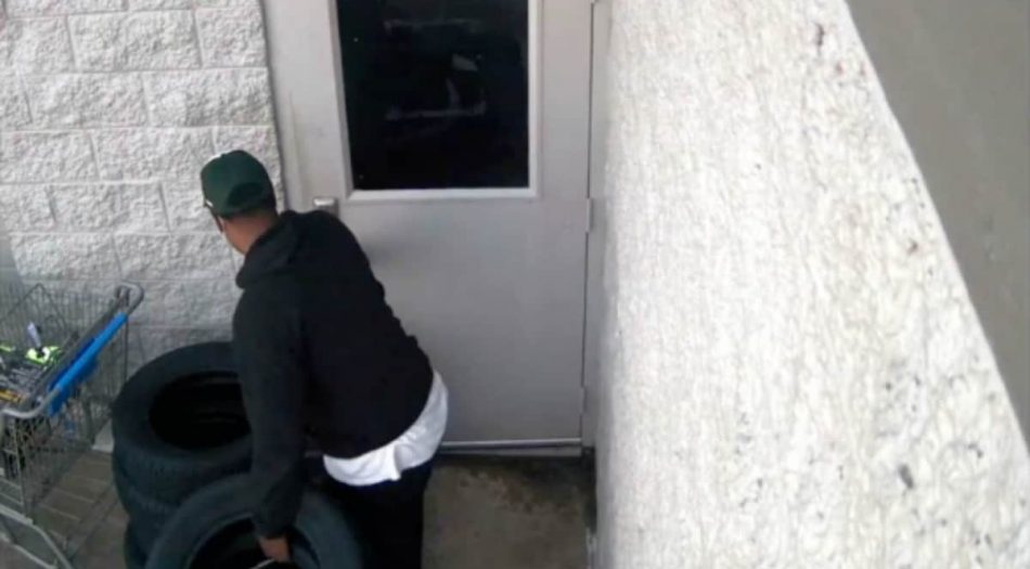 El sujeto fue captado en un video de vigilancia abriendo la puerta y empujando un carrito de compras afuera, luego regresando varias veces para obtener ocho llantas.