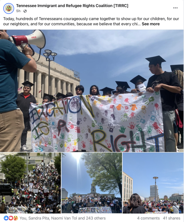 “Hoy, cientos de habitantes de Tennessee se unieron con valentía para defender a nuestros niños, a nuestros vecinos y a nuestras comunidades, porque creemos que todos los niños, sin importar su raza, ingresos o estatus migratorio, merecen acceso a una educación pública de alta calidad. ¡Gracias a cada miembro, colaborador y persona que se unió hoy para hacer oír su voz!”