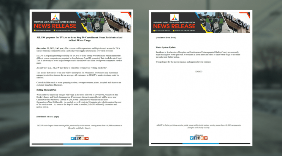 Memphis Light, Gas & Water emitió un comunicado avisando que esperan que Tennessee Valley Authority reactive el protocolo Paso 50 la tarde del viernes 23 de diciembre de 2022.