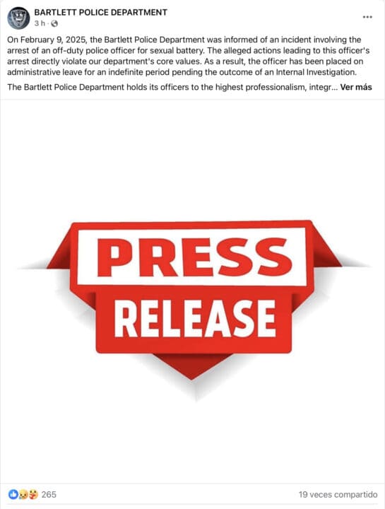 Bartlett, TN – El 9 de febrero de 2025, el Departamento de Policía de Bartlett recibió un informe sobre el arresto de un oficial fuera de servicio, acusado de agresión sexual.