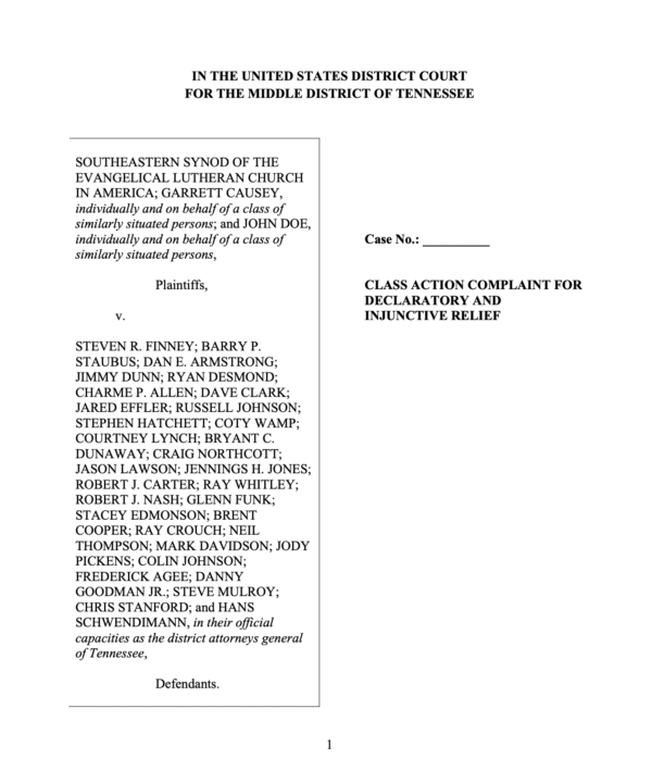 El principal demandante es el Sínodo del Sureste de la Iglesia Evangélica Luterana en América, que se une a un propietario local y a un residente del estado que comparte su vivienda con un yerno solicitante de asilo.