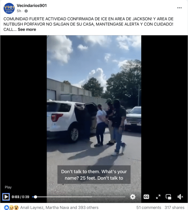 Vecindarios 901 también pidió a los residentes reportar cualquier actividad sospechosa relacionada con ICE y ofrecieron su línea telefónica para recibir denuncias.