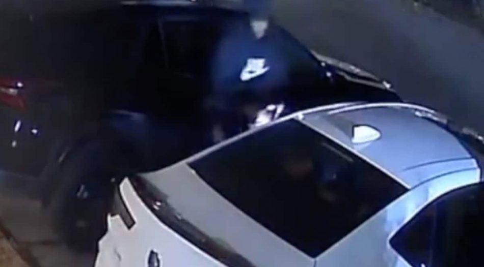 Imágenes de las cámaras de vigilancia muestran a uno de los sospechosos abriendo la puerta de un vehículo blanco en un estacionamiento cercano, junto a una cerca.