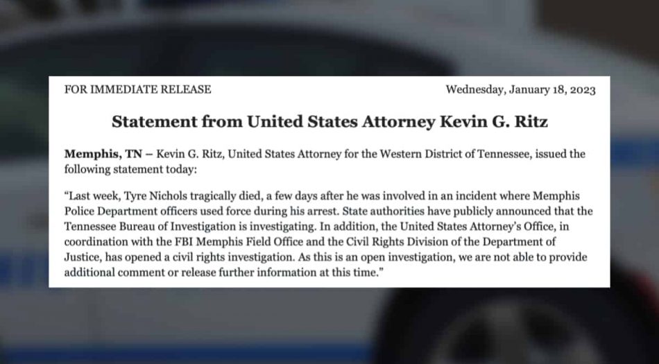 El Fiscal de los Estados Unidos para el Distrito Oeste de Tennessee, Kevin G. Ritz, anunció que se abrió una investigación de derechos civiles a raíz de la trágica muerte de Tyre Nichols.