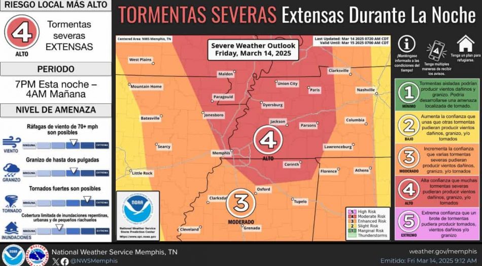 El Servicio Meteorológico Nacional ha elevado el riesgo de clima severo en Memphis al nivel 4 de 5 (ALTO), lo que significa una alta probabilidad de tormentas severas con vientos destructivos, tornados y granizo de gran tamaño.