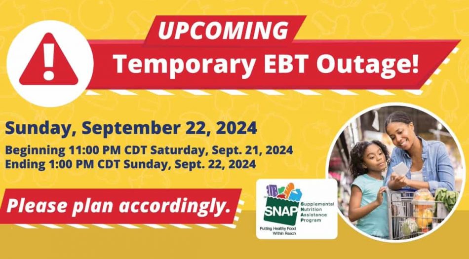 The SNAP and Families First (TANF) #EBT systems will undergo maintenance from 11 PM CST, 9/21/24 until 1 PM CST 9/22/2024. Benefits will be temporarily unavailable during this time. EBT cardholders should plan to shop before or after this window. pic.twitter.com/5LzELypcwz