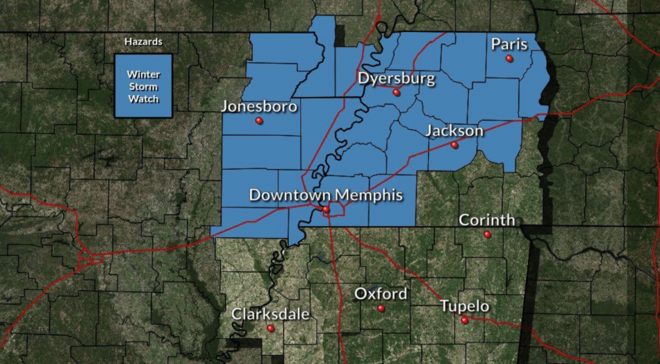 El Servicio Meteorológico Nacional en Memphis emitió una alerta de tormenta de invierno para el este de Arkansas y el oeste de Tennessee para el miércoles por la noche y el jueves por la mañana. El área de vigilancia incluye Memphis, Tennessee y sus suburbios.